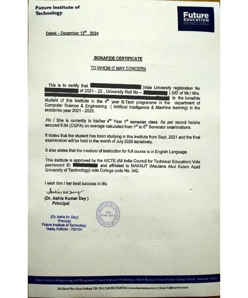A Bonafide Certificate is an official document issued by an educational institution confirming that an individual is a genuine student enrolled in a specific course during a particular academic period.Â